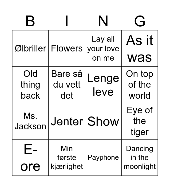 This bingo card has 16 words: Min første kjærlighet, Eye of the tiger, Lay all your love on me, Ølbriller, Ms. Jackson, Flowers, Show, Payphone, Old thing back, Bare så du vett det, E-ore, As it was, Jenter, On top of the world, Lenge leve and Dancing in the moonlight.