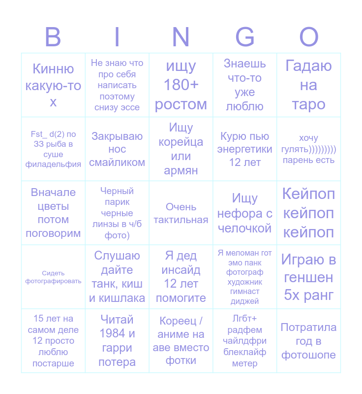 This bingo card has a free space and 24 words: Слушаю дайте танк, киш и кишлака, Читай 1984 и гарри потера, Ищу корейца или армян, 15 лет на самом деле 12 просто люблю постарше, Гадаю на таро, Кинню какую-то х, Fst_ d(2) по ЗЗ рыба в суше филадельфия, Не знаю что про себя написать поэтому снизу эссе, Ищу нефора с челочкой, Я дед инсайд 12 лет помогите, Курю пью энергетики 12 лет, Вначале цветы потом поговорим, Я меломан гот эмо панк фотограф художник гимнаст диджей, Играю в геншен 5x ранг, Закрываю нос смайликом, Лгбт+ радфем чайлдфри блеклайф метер, Кейпоп кейпоп кейпоп, ищу 180+ ростом, хочу гулять))))))))) парень есть, Черный парик черные линзы в ч/б фото), Потратила год в фотошопе, Сидеть фотографировать, Знаешь что-то уже люблю and Кореец /аниме на аве вместо фотки.