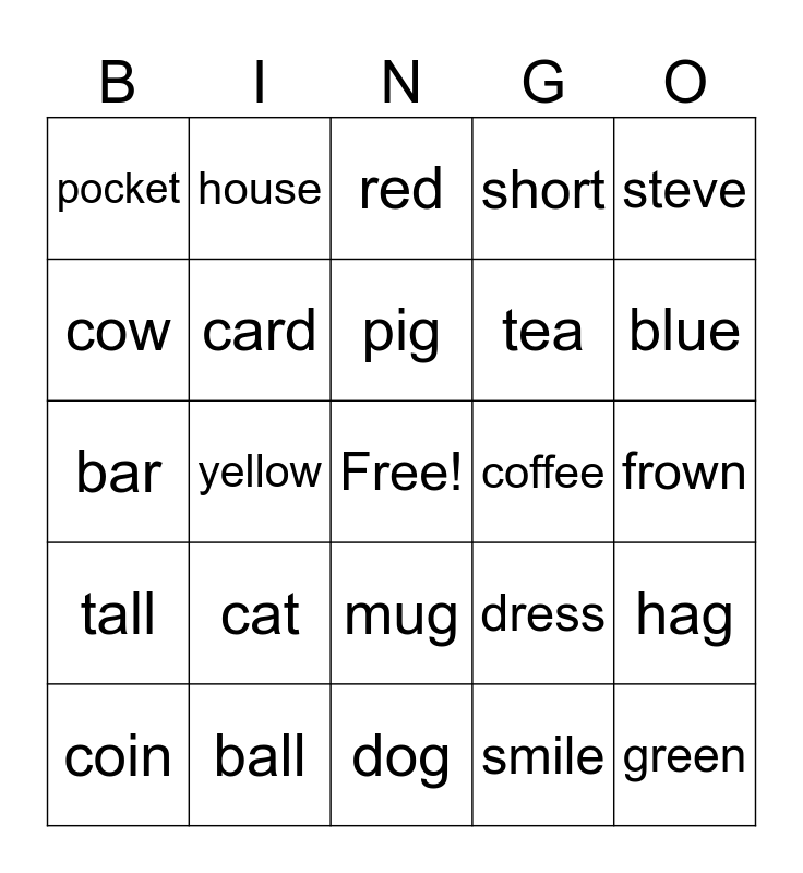 This bingo card has a free space and 24 words: cat, ball, pig, coin, steve, pocket, cow, house, coffee, mug, tea, bar, dress, hag, card, smile, frown, red, blue, yellow, green, tall, short and dog.