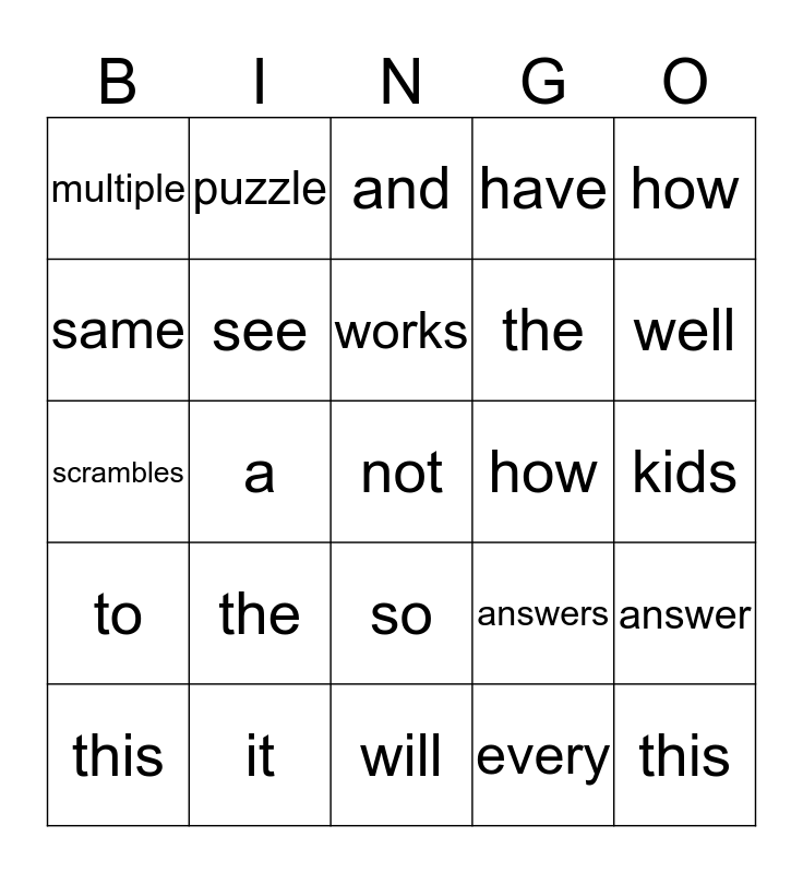 This bingo card has 33 words: this, is, a, test, to, see, how, this, puzzle, maker, works, and, to, see, how, well, it, scrambles, the, answers, so, that, multiple, kids, will, not, have, the, same, answer, on, every and sheet.