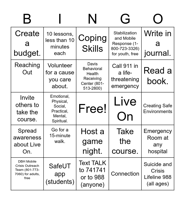 This bingo card has a free space and 24 words: Go for a 15-minute walk., SafeUT app (students), Davis Behavioral Health Receiving Center (801-513-2800), DBH Mobile Crisis Outreach Team (801-773-7060) for adults, free, Write in a journal., Create a budget., Reaching Out, 10 lessons, less than 10 minutes each, Live On, Host a game night., Call 911 in a life-threatening emergency, Invite others to take the course., Take the course., Emergency Room at any hospital, Volunteer for a cause you care about., Connection, Creating Safe Environments, Coping Skills, Read a book., Emotional, Physical, Social, Practical, Mental, Spiritual., Suicide and Crisis Lifeline 988 (all ages), Spread awareness about Live On., Stabilization and Mobile Response (1-800-723-3326) for youth, free and Text TALK to 741741 or to 988 (anyone).