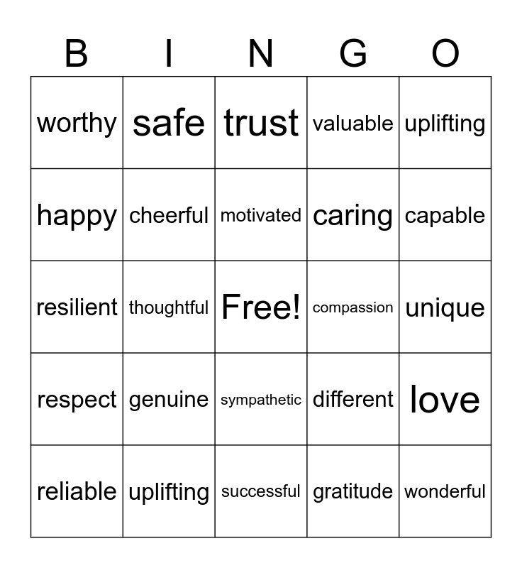 This bingo card has a free space and 28 words: love, help, caring, gratitude, happy, trust, safe, respect, compassion, reliable, resilient, valuable, uplifting, successful, capable, dedicated, genuine, cheerful, motivated, sympathetic, worthy, sensible, wonderful, thoughtful, unique, different, uplifting and healthy.