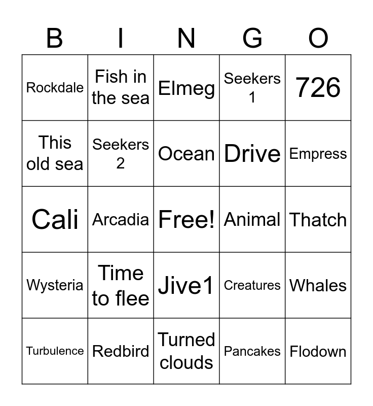 This bingo card has a free space and 29 words: Turbulence, Old man’s boat, Arcadia, Whitelights, Rockdale, Elmeg, Seekers 2, Time to flee, Animal, Redbird, Thatch, Flodown, Turned clouds, Pancakes, Empress, Fiction, Jive1, Wysteria, 726, Cali, Creatures, Jive2, Drive, This old sea, Seekers 1, Fish in the sea, Whales, Ocean and Travelers 2.