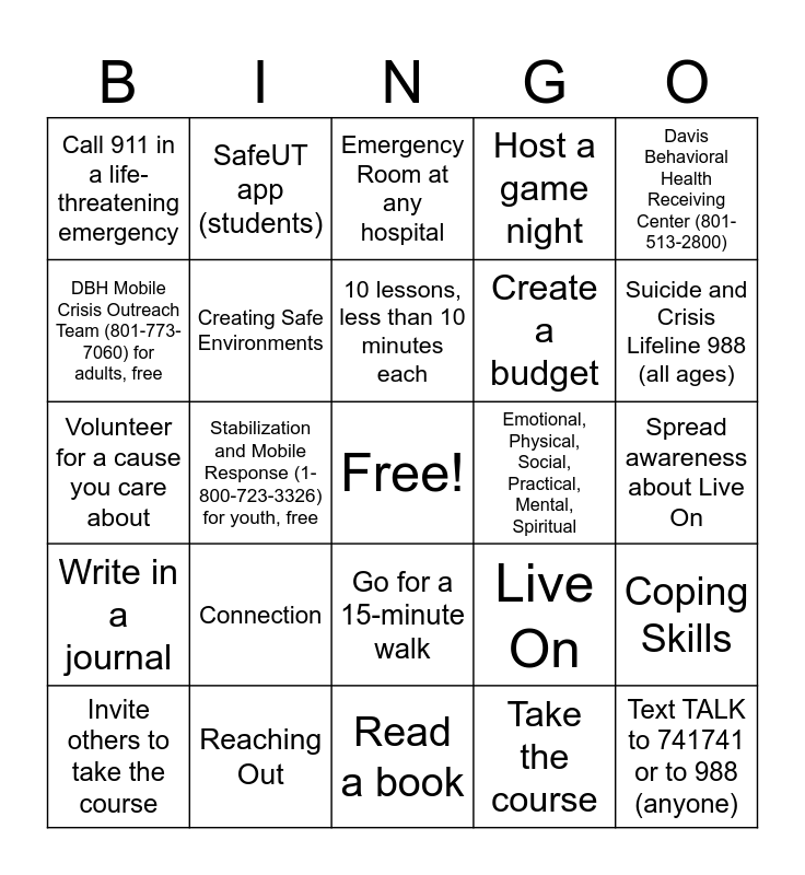 This bingo card has a free space and 24 words: Connection, Reaching Out, 10 lessons, less than 10 minutes each, Invite others to take the course, Davis Behavioral Health Receiving Center (801-513-2800), Call 911 in a life-threatening emergency, DBH Mobile Crisis Outreach Team (801-773-7060) for adults, free, SafeUT app (students), Emotional, Physical, Social, Practical, Mental, Spiritual, Go for a 15-minute walk, Create a budget, Volunteer for a cause you care about, Live On, Coping Skills, Creating Safe Environments, Take the course, Spread awareness about Live On, Emergency Room at any hospital, Suicide and Crisis Lifeline 988 (all ages), Stabilization and Mobile Response (1-800-723-3326) for youth, free, Text TALK to 741741 or to 988 (anyone), Write in a journal, Host a game night and Read a book.