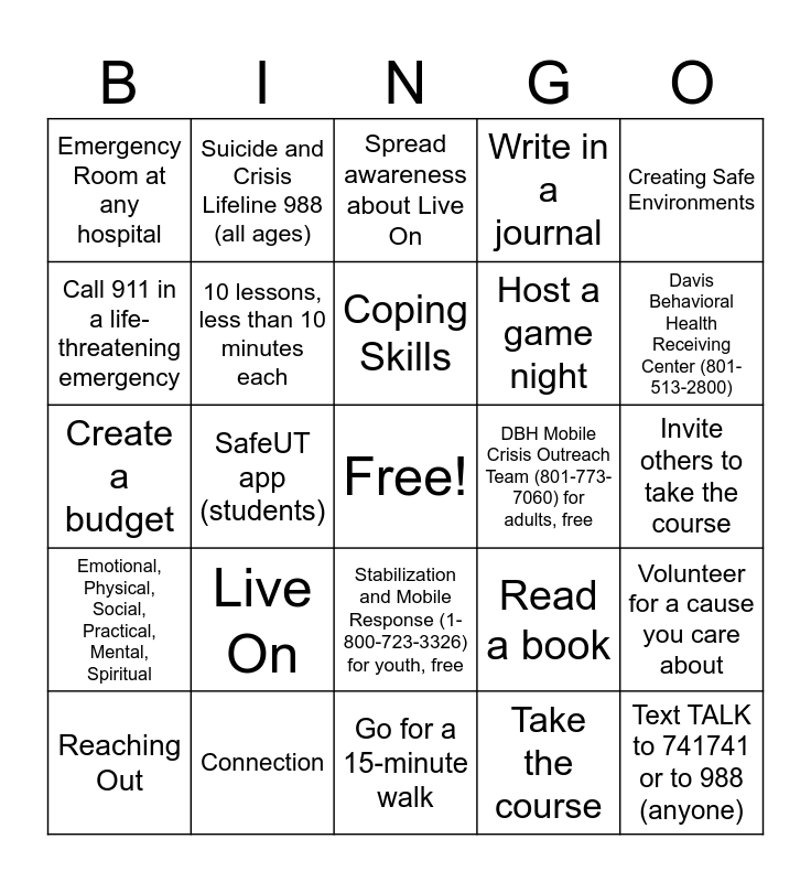This bingo card has a free space and 24 words: Live On, Connection, Coping Skills, Reaching Out, Creating Safe Environments, Emergency Room at any hospital, Call 911 in a life-threatening emergency, Suicide and Crisis Lifeline 988 (all ages), DBH Mobile Crisis Outreach Team (801-773-7060) for adults, free, Stabilization and Mobile Response (1-800-723-3326) for youth, free, Host a game night, Create a budget, Read a book, Volunteer for a cause you care about, 10 lessons, less than 10 minutes each, Take the course, Invite others to take the course, Spread awareness about Live On, Davis Behavioral Health Receiving Center (801-513-2800), SafeUT app (students), Text TALK to 741741 or to 988 (anyone), Emotional, Physical, Social, Practical, Mental, Spiritual, Write in a journal and Go for a 15-minute walk.
