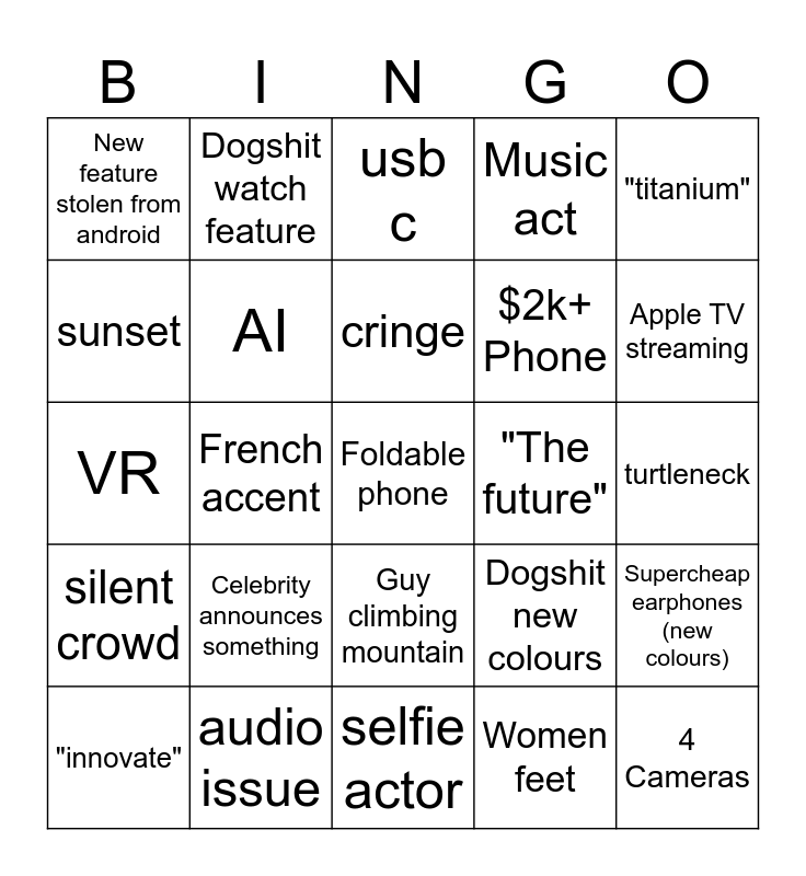 This bingo card has 25 words: Celebrity announces something, selfie actor, cringe, "innovate", "titanium", New feature stolen from android, sunset, Dogshit watch feature, "The future", Guy climbing mountain, $2k+ Phone, VR, Dogshit new colours, Supercheap earphones (new colours), AI, 4 Cameras, turtleneck, usb c, Apple TV streaming, French accent, Foldable phone, audio issue, silent crowd, Music act and Women feet.
