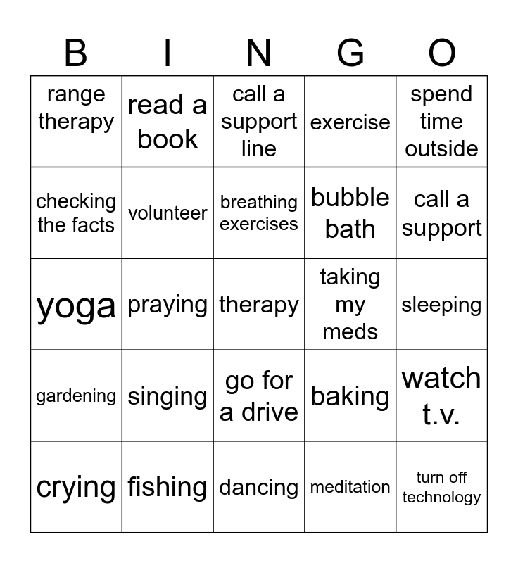 This bingo card has a free space and 29 words: crying, walk my dog, praying, vacation, range therapy, call a support line, volunteer, singing, taking my meds, fishing, sleeping, turn off technology, dancing, meditation, call a support, journaling, go for a drive, gardening, spend time outside, yoga, baking, listen to music, bubble bath, checking the facts, exercise, read a book, watch t.v., breathing exercises and gratitude list.