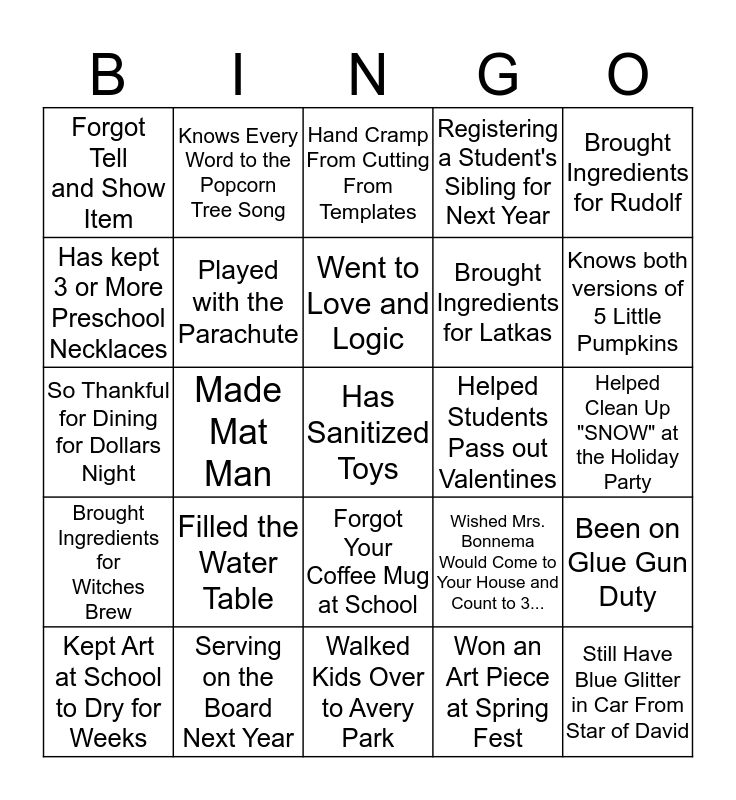 This bingo card has 25 words: Filled the Water Table, Walked Kids Over to Avery Park, Went to Love and Logic, Kept Art at School to Dry for Weeks, Brought Ingredients for Rudolf, Forgot Tell and Show Item, Has kept 3 or More Preschool Necklaces, Knows Every Word to the Popcorn Tree Song, Helped Students Pass out Valentines, Forgot Your Coffee Mug at School, Brought Ingredients for Latkas, So Thankful for Dining for Dollars Night, Wished Mrs. Bonnema Would Come to Your House and Count to 3..., Been on Glue Gun Duty, Played with the Parachute, Still Have Blue Glitter in Car From Star of David, Helped Clean Up "SNOW" at the Holiday Party, Hand Cramp From Cutting From Templates, Knows both versions of 5 Little Pumpkins, Made Mat Man, Has Sanitized Toys, Serving on the Board Next Year, Brought Ingredients for Witches Brew, Registering a Student's Sibling for Next Year and Won an Art Piece at Spring Fest.