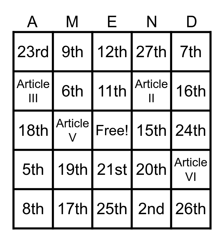 This bingo card has a free space and 34 words: 1st, 2nd, 3rd, 4th, 5th, 6th, 7th, 8th, 9th, 10th, 11th, 12th, 13th, 14th, 15th, 16th, 17th, 18th, 19th, 20th, 21st, 22nd, 23rd, 24th, 25th, 26th, 27th, Article I, Article II, Article III, Article IV, Article V, Article VI and Article VII.