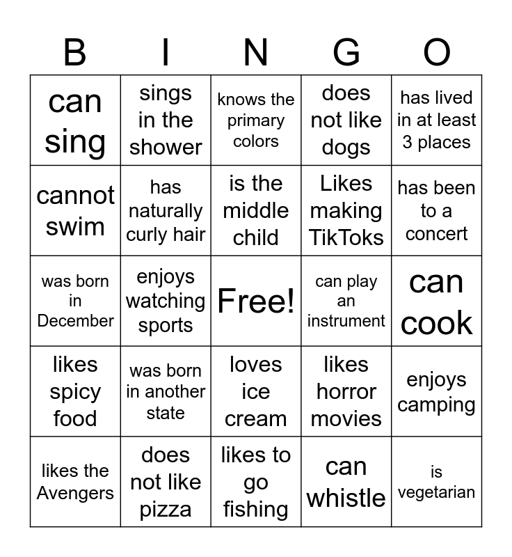 This bingo card has a free space and 54 words: likes to read, likes spicy food, wears contacts or glasses, is left handed, loves ice cream, has a job, does not like dogs, has been to London, cannot swim, has 3 or more siblings, can sing, likes listening to music, does not like pizza, likes the Avengers, is an only child, likes to go fishing, is vegetarian, Likes making TikToks, likes to play basketball, can cook, likes horror movies, likes cats, can play an instrument, has lived in at least 3 places, plays video games, sings in the shower, plays a sport, has a pet other than a dog/cat, has broken a bone or had stitches, can whistle, loves math, is wearing something green, can speak another language, read at least 2 books this summer, knows the primary colors, has only brothers, was born in December, enjoys camping, likes to garden, has naturally curly hair, has/had braces, has only brothers, has only sisters, sings in a choir, was born in another state, has allergies, has run a 5k, has a summer birthday, is the middle child, enjoys watching sports, has been to a concert, went boating this summer, writes poetry or fiction and colors their hair.