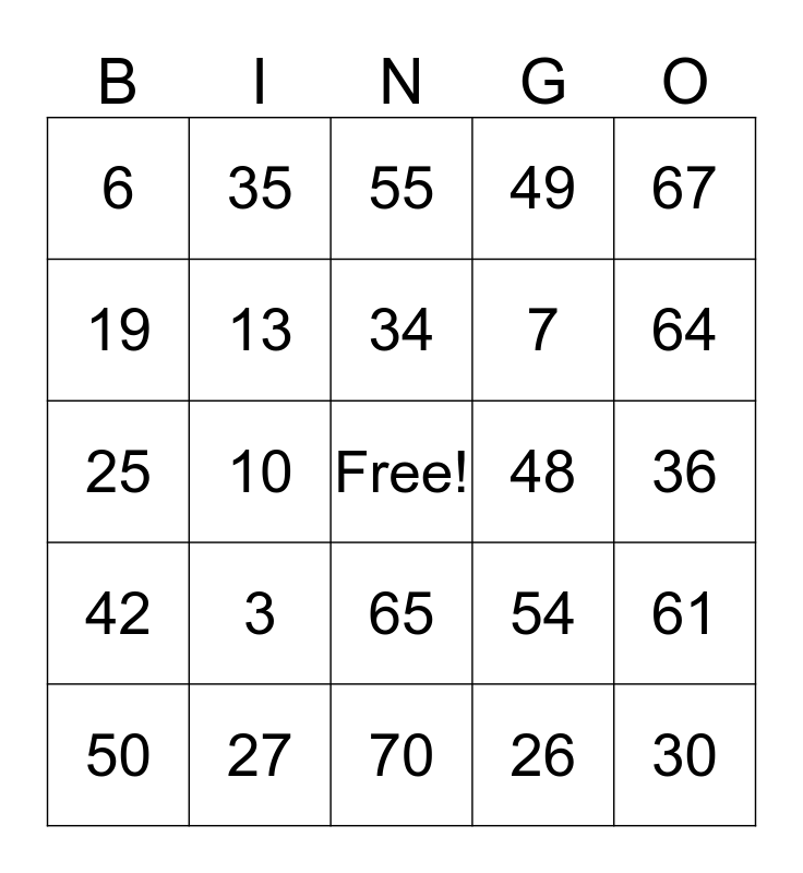 This bingo card has a free space and 24 words: 3, 27, 34, 50, 67, 6, 19, 35, 48, 65, 7, 25, 54, 61, 13, 26, 36, 55, 64, 10, 30, 42, 49 and 70.