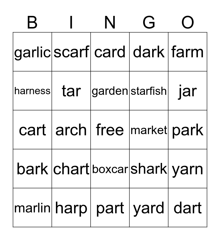 This bingo card has a free space and 24 words: chart, harp, garden, marlin, farm, garlic, harness, scarf, market, boxcar, starfish, cart, shark, yarn, tar, yard, park, card, jar, arch, dart, bark, dark and part.