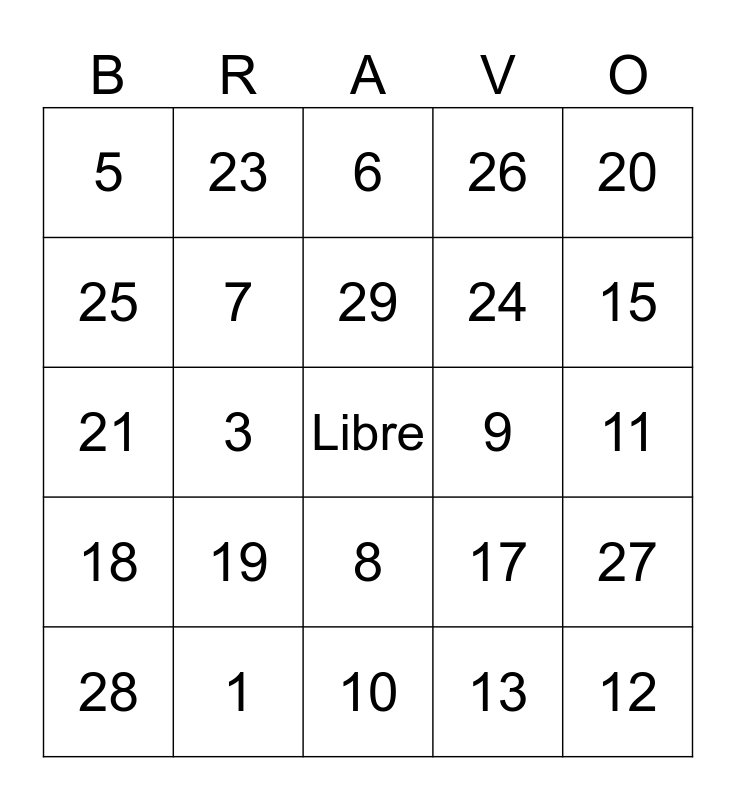 This bingo card has a free space and 30 words: 1, 2, 3, 4, 5, 6, 7, 8, 9, 10, 11, 12, 13, 14, 15, 16, 17, 18, 19, 20, 21, 22, 23, 24, 25, 26, 27, 28, 29 and 30.