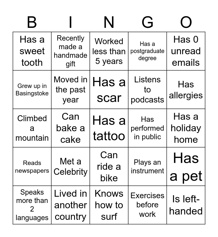 This bingo card has 25 words: Met a Celebrity, Knows how to surf, Has a scar, Speaks more than 2 languages, Has 0 unread emails, Has a sweet tooth, Grew up in Basingstoke, Recently made a handmade gift, Has performed in public, Can ride a bike, Listens to podcasts, Climbed a mountain, Plays an instrument, Has a pet, Moved in the past year, Is left-handed, Has a holiday home, Worked less than 5 years, Has allergies, Can bake a cake, Has a tattoo, Lived in another country, Reads newspapers, Has a postgraduate degree and Exercises before work.