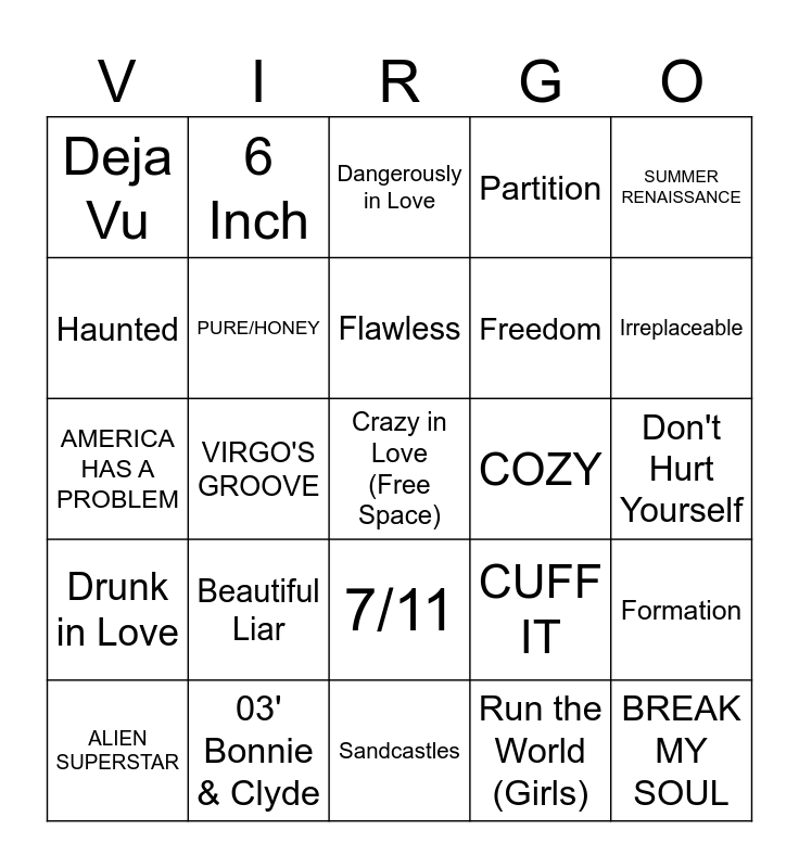 This bingo card has a free space and 24 words: Beautiful Liar, 03' Bonnie & Clyde, Flawless, ALIEN SUPERSTAR, SUMMER RENAISSANCE, Deja Vu, Haunted, 6 Inch, COZY, 7/11, Freedom, AMERICA HAS A PROBLEM, CUFF IT, Formation, PURE/HONEY, Run the World (Girls), Don't Hurt Yourself, Dangerously in Love, Irreplaceable, VIRGO'S GROOVE, BREAK MY SOUL, Drunk in Love, Partition and Sandcastles.