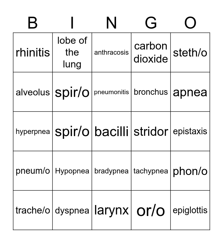 This bingo card has a free space and 34 words: nas/o, or/o, pharyng/o, phon/o, pneum/o, spir/o, steth/o, trache/o, lobe of the lung, hoarseness, pneumonitis, anthracosis, atelectasis, hemoptysis, stridor, apnea, dyspnea, hyperpnea, Hypopnea, tachypnea, bradypnea, eupnea, rhinitis, epistaxis, larynx, epiglottis, carbon dioxide, bronchiole, bronchus, alveolus, adenoid, spir/o, phon/o and dysphonia.