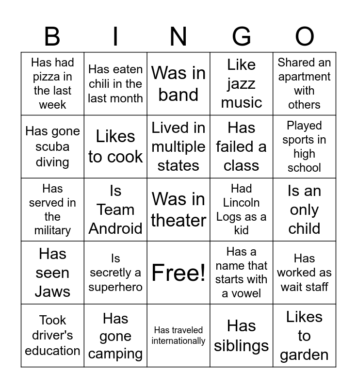 This bingo card has 26 words: Free!, Has siblings, Lived in multiple states, Has gone camping, Shared an apartment with others, Has had pizza in the last week, Has gone scuba diving, Has eaten chili in the last month, Is an only child, Has a name that starts with a vowel, Has failed a class, Has served in the military, Has worked as wait staff, Took driver's education, Is Team Android, Was a babysitter, Like jazz music, Has seen Jaws, Was in band, Was in theater, Played sports in high school, Has traveled internationally, Had Lincoln Logs as a kid, Is secretly a superhero, Likes to cook and Likes to garden.