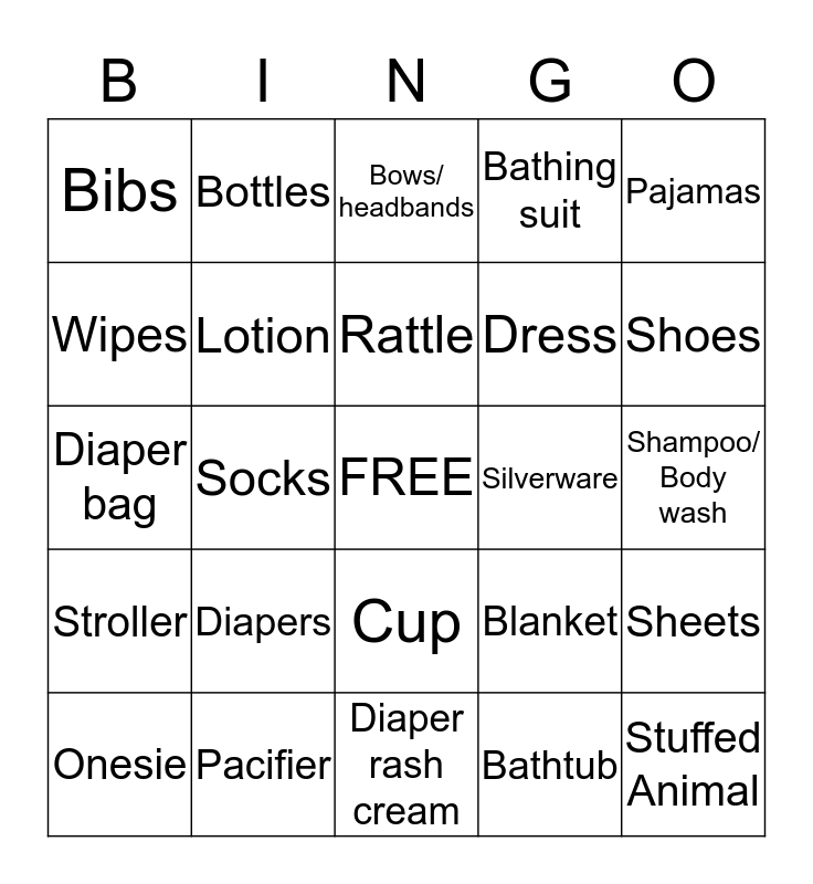 This bingo card has a free space and 24 words: Diapers, Pacifier, Rattle, Onesie, Pajamas, Bibs, Wipes, Bottles, Silverware, Cup, Dress, Diaper bag, Blanket, Sheets, Lotion, Bathtub, Shampoo/ Body wash, Bows/ headbands, Shoes, Socks, Stuffed Animal, Stroller, Bathing suit and Diaper rash cream.