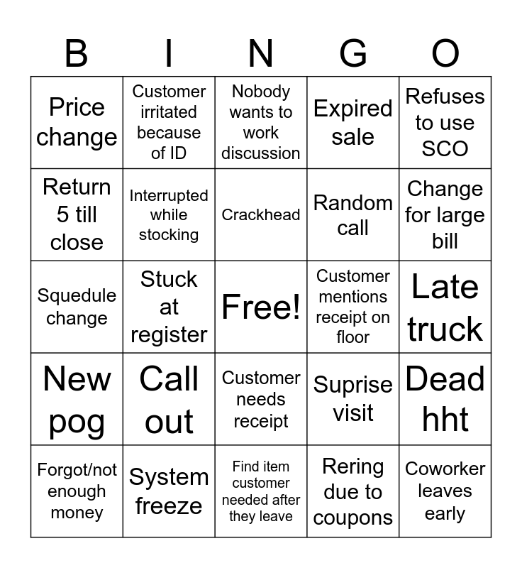 This bingo card has a free space and 24 words: Call out, System freeze, Crackhead, Forgot/not enough money, Refuses to use SCO, Price change, Return 5 till close, Customer irritated because of ID, Customer mentions receipt on floor, Customer needs receipt, Random call, Squedule change, Suprise visit, Dead hht, Interrupted while stocking, Rering due to coupons, Late truck, Nobody wants to work discussion, Change for large bill, Stuck at register, Coworker leaves early, New pog, Expired sale and Find item customer needed after they leave.