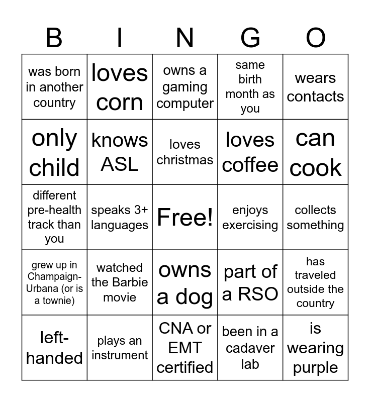 This bingo card has a free space and 24 words: watched the Barbie movie, plays an instrument, loves christmas, left-handed, wears contacts, was born in another country, only child, loves corn, enjoys exercising, owns a dog, loves coffee, different pre-health track than you, part of a RSO, has traveled outside the country, knows ASL, been in a cadaver lab, collects something, owns a gaming computer, can cook, speaks 3+ languages, is wearing purple, grew up in Champaign-Urbana (or is a townie), same birth month as you and CNA or EMT certified.
