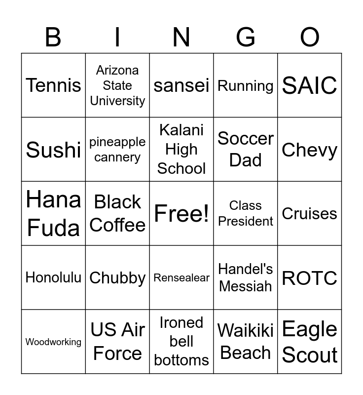 This bingo card has a free space and 26 words: Rensealear, Waikiki Beach, Kalani High School, US Air Force, SAIC, Tennis, Sushi, Arizona State University, Cruises, Handel's Messiah, Soccer Dad, Hana Fuda, ROTC, Woodworking, Black Coffee, Swimming, Running, Honolulu, sansei, Eagle Scout, Chevy, Ironed bell bottoms, Class President, Chubby, pineapple cannery and Dancer.