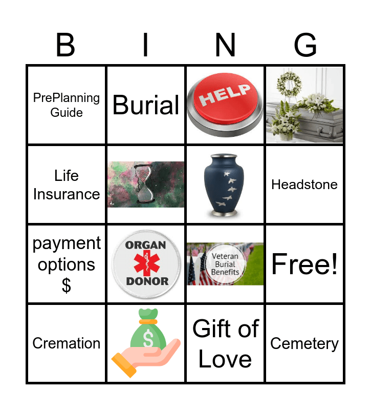 This bingo card has 7 images and 9 words: Free!, PrePlanning Guide, payment options $, Burial, Gift of Love, Life Insurance, Cremation, Headstone and Cemetery.