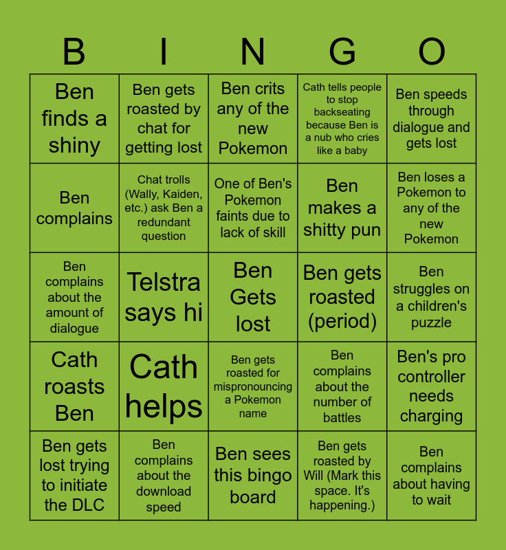 This bingo card has a free space and 24 words: Cath helps, Ben complains about the download speed, One of Ben's Pokemon faints due to lack of skill, Ben gets lost trying to initiate the DLC, Ben speeds through dialogue and gets lost, Ben finds a shiny, Ben complains, Ben gets roasted by chat for getting lost, Ben gets roasted (period), Ben gets roasted for mispronouncing a Pokemon name, Ben makes a shitty pun, Ben complains about the amount of dialogue, Ben complains about the number of battles, Ben's pro controller needs charging, Chat trolls (Wally, Kaiden, etc.) ask Ben a redundant question, Ben gets roasted by Will (Mark this space. It's happening.), Ben struggles on a children's puzzle, Ben crits any of the new Pokemon, Ben loses a Pokemon to any of the new Pokemon, Telstra says hi, Ben complains about having to wait, Cath roasts Ben, Cath tells people to stop backseating because Ben is a nub who cries like a baby and Ben sees this bingo board.