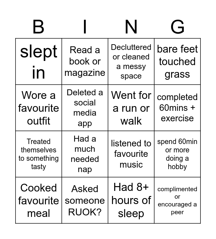 This bingo card has 25 words: Laughed uncontrollably at something/ with someone, Drank enough water for the day, completed 60mins + exercise, Said yes to something usually would say no to, Wore a favourite outfit, slept in, Deleted a social media app, Read a book or magazine, Asked someone RUOK?, Had a long shower or bath, Treated themselves to something tasty, listened to favourite music, Meditated or prayed, Write in a journal/ diary, Went for a run or walk, Took a mental health day, Had 8+ hours of sleep, Decluttered or cleaned a messy space, Had a much needed nap, spend 60min or more doing a hobby, Cooked favourite meal, Ate a prepared and nutritious meal at school, complimented or encouraged a peer, bare feet touched grass and caught up with a close friend.