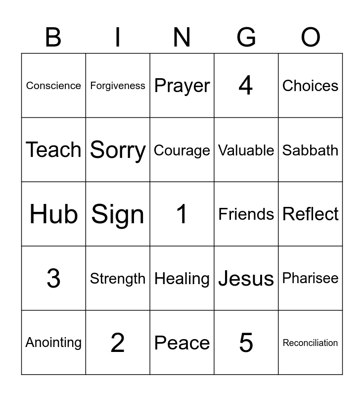 This bingo card has 25 words: Strength, Peace, Courage, Anointing, Choices, Conscience, Teach, Forgiveness, Friends, Healing, Valuable, Hub, Jesus, Pharisee, Sorry, Reconciliation, Reflect, Prayer, Sabbath, Sign, 1, 2, 3, 4 and 5.