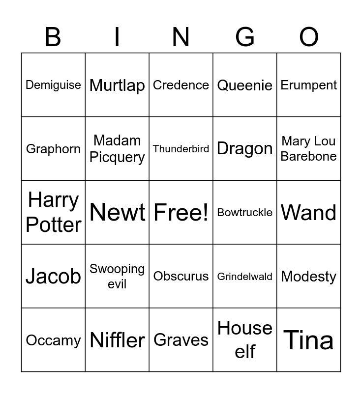 This bingo card has a free space and 24 words: Swooping evil, Niffler, Thunderbird, Occamy, Erumpent, Demiguise, Graphorn, Murtlap, Bowtruckle, Obscurus, Dragon, Harry Potter, Grindelwald, Modesty, Madam Picquery, House elf, Wand, Credence, Mary Lou Barebone, Newt, Tina, Jacob, Queenie and Graves.