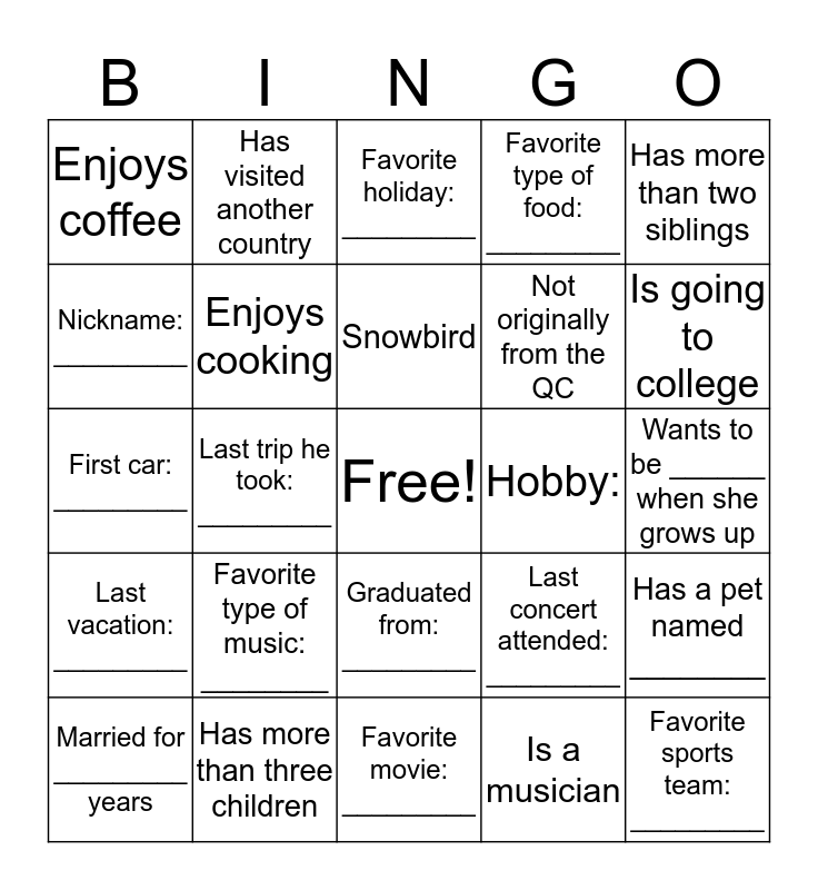 This bingo card has a free space and 24 words: Favorite type of music: ________, Has more than three children, Snowbird, Married for _________ years, Has more than two siblings, Enjoys coffee, Nickname: _________, Has visited another country, Hobby:, Graduated from: _________, Not originally from the QC, First car: _________, Last concert attended: _________, Has a pet named ________, Enjoys cooking, Is a musician, Wants to be ______ when she grows up, Favorite holiday: _________, Is going to college, Last trip he took: _________, Favorite sports team: _________, Last vacation: _________, Favorite type of food: _________ and Favorite movie: _________.