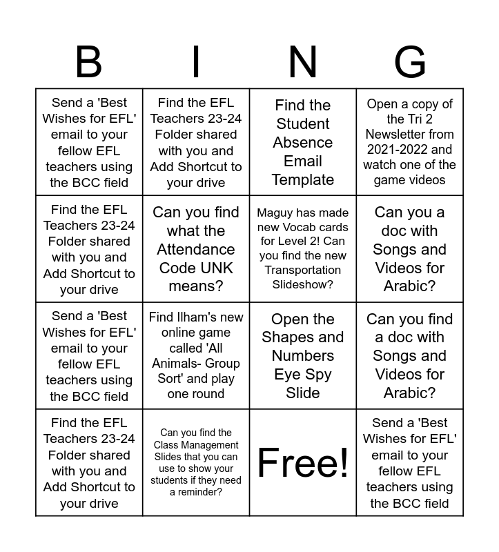This bingo card has 17 words: Free!, Find the EFL Teachers 23-24 Folder shared with you and Add Shortcut to your drive, Find the Student Absence Email Template, Send a 'Best Wishes for EFL' email to your fellow EFL teachers using the BCC field, Find Ilham's new online game called 'All Animals- Group Sort' and play one round, Open a copy of the Tri 2 Newsletter from 2021-2022 and watch one of the game videos, Can you find a doc with Songs and Videos for Arabic?, Maguy has made new Vocab cards for Level 2! Can you find the new Transportation Slideshow?, Can you a doc with Songs and Videos for Arabic?, Can you find what the Attendance Code UNK means?, Can you find the Class Management Slides that you can use to show your students if they need a reminder?, Open the Shapes and Numbers Eye Spy Slide, Find the EFL Teachers 23-24 Folder shared with you and Add Shortcut to your drive, Find the EFL Teachers 23-24 Folder shared with you and Add Shortcut to your drive, Send a 'Best Wishes for EFL' email to your fellow EFL teachers using the BCC field, Send a 'Best Wishes for EFL' email to your fellow EFL teachers using the BCC field and Send a 'Best Wishes for EFL' email to your fellow EFL teachers using the BCC field.