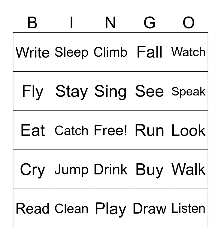 This bingo card has a free space and 25 words: Jump, Play, Sing, Read, Watch, Write, Fly, Sleep, Run, Drink, See, Eat, Buy, Walk, Stay, Drive, Look, Climb, Speak, Catch, Listen, Clean, Cry, Fall and Draw.