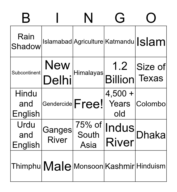 This bingo card has a free space and 24 words: Ganges River, Male, Himalayas, Thimphu, Islam, Rain Shadow, Subcontinent, Islamabad, 4,500 + Years old, 75% of South Asia, 1.2 Billion, Hindu and English, Indus River, Dhaka, New Delhi, Kashmir, Colombo, Agriculture, Size of Texas, Gendercide, Hinduism, Urdu and English, Katmandu and Monsoon.