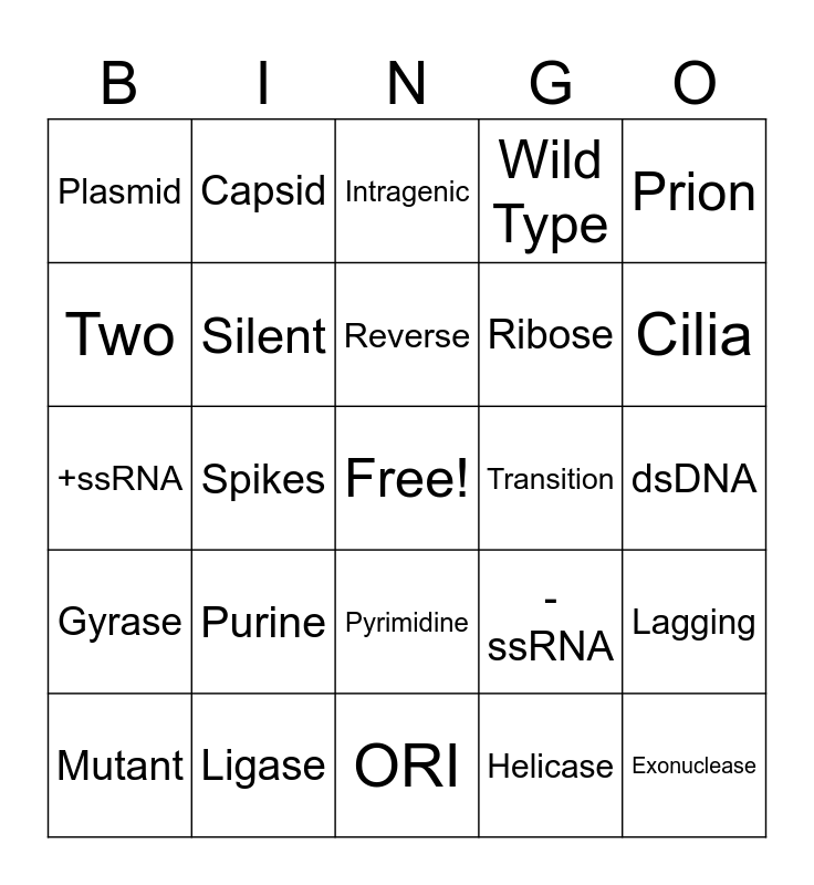 This bingo card has a free space and 24 words: Purine, Ligase, Reverse, Mutant, Prion, Plasmid, Two, Capsid, Transition, Pyrimidine, Ribose, +ssRNA, -ssRNA, Lagging, Silent, Helicase, dsDNA, Intragenic, Cilia, Spikes, Exonuclease, Gyrase, Wild Type and ORI.