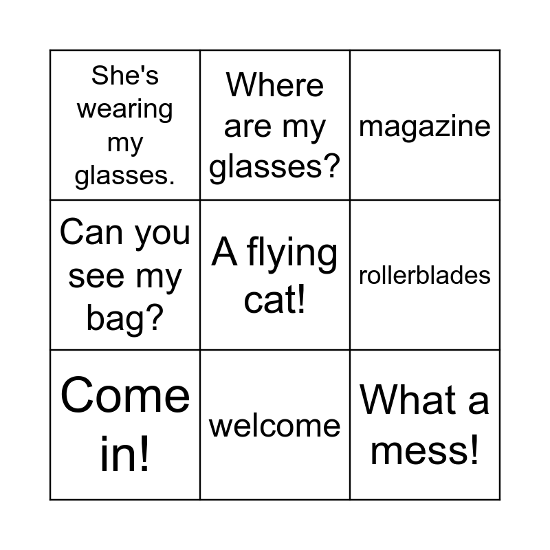 This bingo card has 13 words: Scat, cat!, Go away!, Come in!, Where are my glasses?, Can you see my bag?, A flying cat!, What a mess!, member of the club, welcome, She's wearing my glasses., rollerblades, magazine and umbrella sweets.