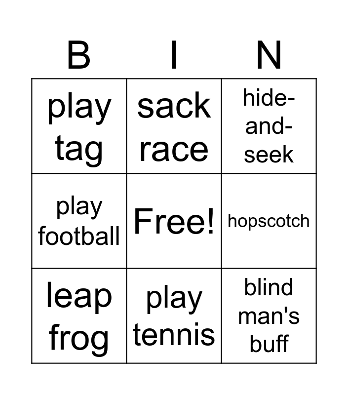 This bingo card has a free space and 8 words: hopscotch, hide-and-seek, sack race, leap frog, play tag, blind man's buff, play football and play tennis.