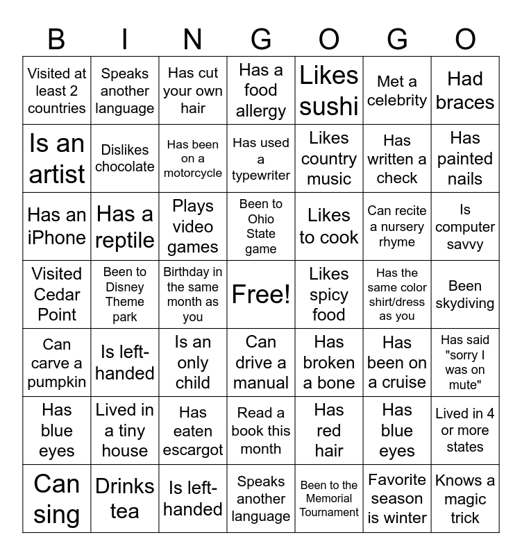 This bingo card has a free space and 62 words: Has green eyes, Visited Cedar Point, Been rock climbing, Has a reptile, Knows a magic trick, Lived in 4 or more states, Had braces, Youngest in family, Dislikes chocolate, Can sing, Has a food allergy, Read a book this month, Met a celebrity, Likes spicy food, Has a tattoo, Visited at least 2 countries, Has written a check, Likes sushi, Drive a manual, Is an artist, Has painted nails, Has cut your own hair, Is computer savvy, Birthday in the same month as you, Lived in a tiny house, Has broken a bone, Is left-handed, Hates to clean bathroom, Can recite a nursery rhyme, Has said "sorry I was on mute", Been on a cruise, Has eaten escargot, Favorite season is winter, Can play an instrument, Has an iPhone, Speaks another language, Has red hair, Has been on a cruise, Likes country music, Has the same color shirt/dress as you, Has used a typewriter, Has blue eyes, Plays video games, Has a cat, Has been on a motorcycle, Likes to cook, Is an only child, Drinks tea, Speaks another language, Been to the Memorial Tournament, Been to Ohio State game, Been to Disney Theme park, Has a dog, Lived in a tiny house, Plays a sport, Been skydiving, Can drive a manual, Has blue eyes, Is left-handed, Has been to Florida, Can carve a pumpkin and Can't wait for McRib sandwich season.