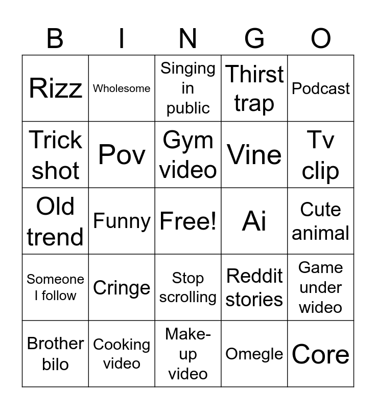 This bingo card has a free space and 24 words: Cringe, Cooking video, Gym video, Brother bilo, Podcast, Rizz, Trick shot, Wholesome, Ai, Stop scrolling, Vine, Old trend, Reddit stories, Game under wideo, Pov, Omegle, Cute animal, Singing in public, Tv clip, Funny, Core, Someone I follow, Thirst trap and Make-up video.