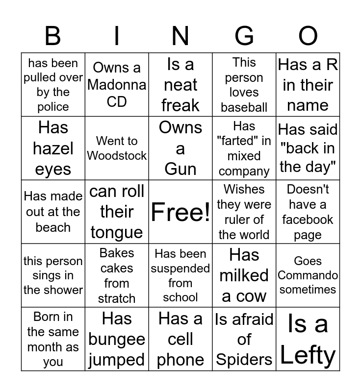 This bingo card has a free space and 24 words: Bakes cakes from stratch, Has bungee jumped, Owns a Gun, Born in the same month as you, Has a R in their name, has been pulled over by the police, Has hazel eyes, Owns a Madonna CD, Wishes they were ruler of the world, Has been suspended from school, Has "farted" in mixed company, Has made out at the beach, Has milked a cow, Goes Commando sometimes, Went to Woodstock, Is afraid of Spiders, Doesn't have a facebook page, Is a neat freak, Has said "back in the day", can roll their tongue, Is a Lefty, this person sings in the shower, This person loves baseball and Has a cell phone.