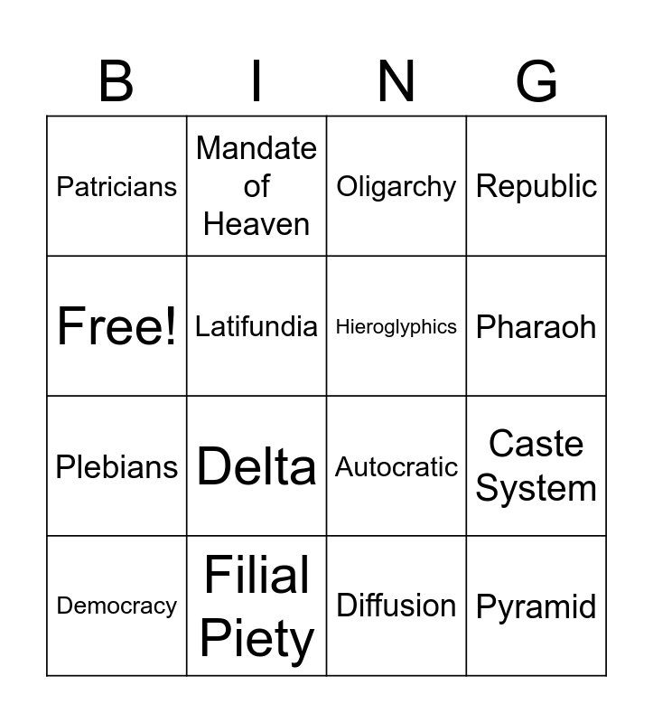 This bingo card has 16 words: Filial Piety, Caste System, Oligarchy, Patricians, Plebians, Mandate of Heaven, Autocratic, Diffusion, Free!, Latifundia, Democracy, Republic, Delta, Pharaoh, Hieroglyphics and Pyramid.