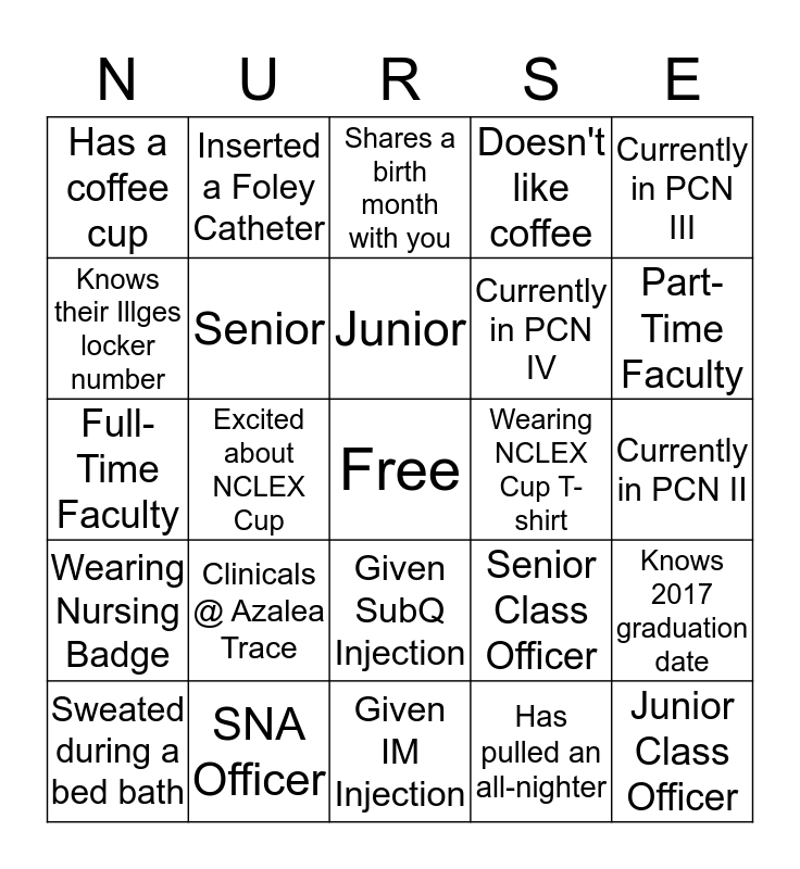 This bingo card has a free space and 24 words: Clinicals @ Azalea Trace, SNA Officer, Junior, Sweated during a bed bath, Currently in PCN III, Has a coffee cup, Knows their Illges locker number, Inserted a Foley Catheter, Wearing NCLEX Cup T-shirt, Given SubQ Injection, Currently in PCN IV, Full-Time Faculty, Senior Class Officer, Knows 2017 graduation date, Senior, Has pulled an all-nighter, Currently in PCN II, Shares a birth month with you, Part-Time Faculty, Excited about NCLEX Cup, Junior Class Officer, Wearing Nursing Badge, Doesn't like coffee and Given IM Injection.