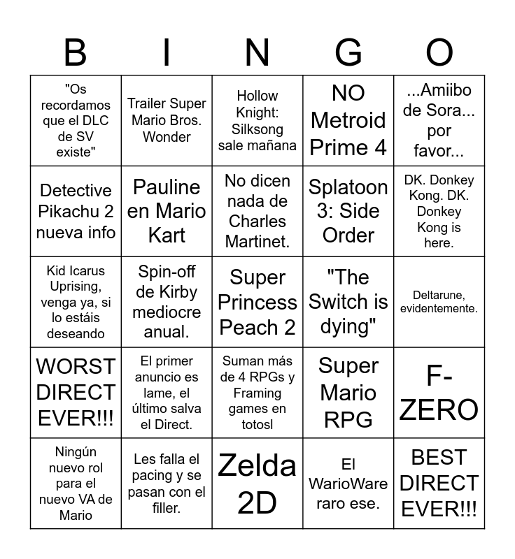 This bingo card has a free space and 24 words: El primer anuncio es lame, el último salva el Direct., Les falla el pacing y se pasan con el filler., No dicen nada de Charles Martinet., Ningún nuevo rol para el nuevo VA de Mario, ...Amiibo de Sora... por favor..., "Os recordamos que el DLC de SV existe", Detective Pikachu 2 nueva info, Trailer Super Mario Bros. Wonder, "The Switch is dying", Suman más de 4 RPGs y Framing games en totosl, Splatoon 3: Side Order, Kid Icarus Uprising, venga ya, si lo estáis deseando, Super Mario RPG, F-ZERO, Pauline en Mario Kart, El WarioWare raro ese., Deltarune, evidentemente., Hollow Knight: Silksong sale mañana, DK. Donkey Kong. DK. Donkey Kong is here., Spin-off de Kirby mediocre anual., BEST DIRECT EVER!!!, WORST DIRECT EVER!!!, NO Metroid Prime 4 and Zelda 2D.