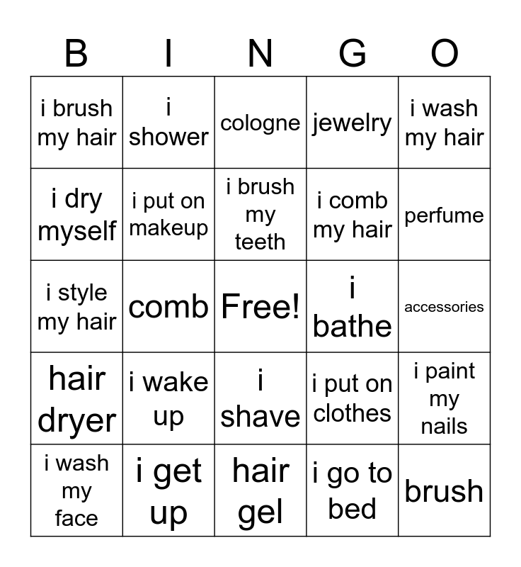 This bingo card has a free space and 24 words: i wake up, i get up, i brush my teeth, i wash my face, i wash my hair, i brush my hair, i dry myself, i shower, i bathe, i shave, i comb my hair, i style my hair, i put on clothes, i paint my nails, i put on makeup, i go to bed, accessories, cologne, perfume, comb, brush, hair dryer, jewelry and hair gel.