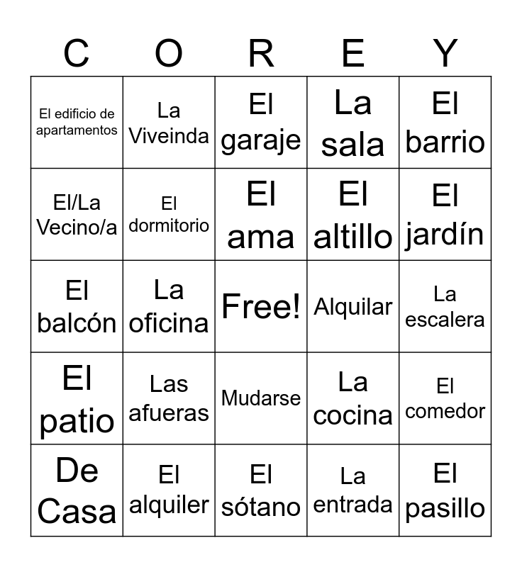 This bingo card has a free space and 24 words: Las afueras, El alquiler, El ama, De Casa, El barrio, El edificio de apartamentos, El/La Vecino/a, La Viveinda, Alquilar, Mudarse, El altillo, El balcón, La cocina, El comedor, El dormitorio, La entrada, La escalera, El garaje, El jardín, La oficina, El pasillo, El patio, La sala and El sótano.