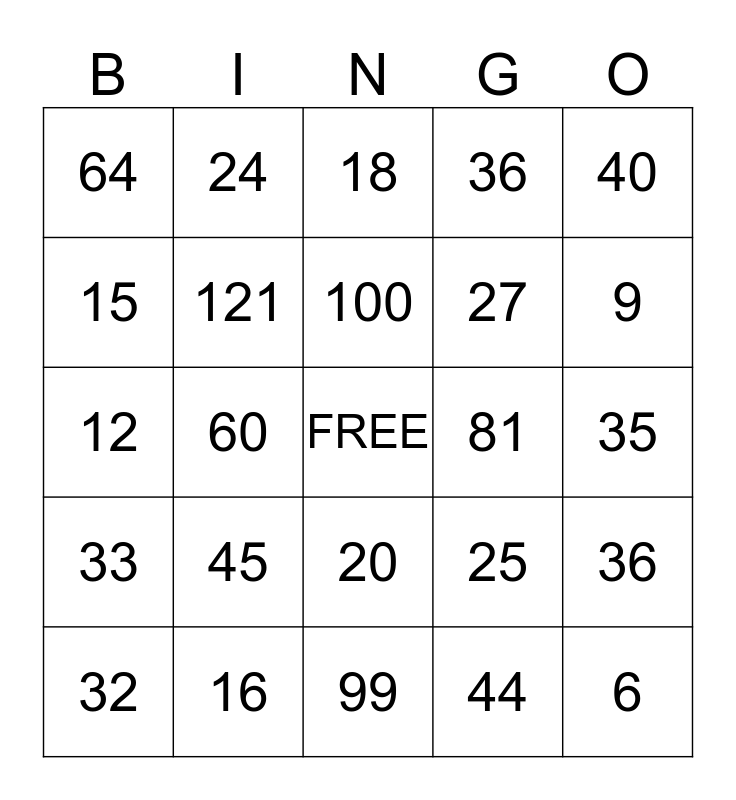 This bingo card has a free space and 24 words: 45, 16, 100, 32, 40, 64, 15, 24, 81, 20, 27, 12, 25, 36, 121, 44, 35, 18, 9, 60, 6, 33, 36 and 99.