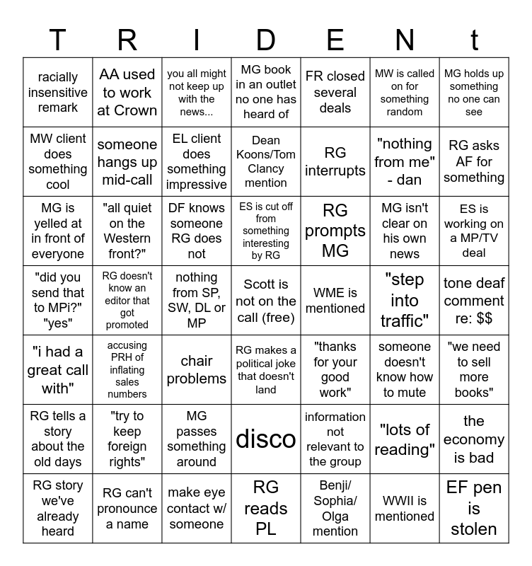 This bingo card has a free space and 48 words: information not relevant to the group, "nothing from me" - dan, RG reads PL, RG doesn't know an editor that got promoted, DF knows someone RG does not, tone deaf comment re: $$, AA used to work at Crown, RG can't pronounce a name, MW is called on for something random, RG makes a political joke that doesn't land, MG holds up something no one can see, MG book in an outlet no one has heard of, MG isn't clear on his own news, RG prompts MG, RG tells a story about the old days, "step into traffic", MW client does something cool, RG asks AF for something, "lots of reading", FR closed several deals, RG interrupts, nothing from SP, SW, DL or MP, racially insensitive remark, someone hangs up mid-call, the economy is bad, EL client does something impressive, ES is working on a MP/TV deal, RG story we've already heard, ES is cut off from something interesting by RG, "all quiet on the Western front?", WWII is mentioned, WME is mentioned, "we need to sell more books", "try to keep foreign rights", "did you send that to MPi?" "yes", "thanks for your good work", someone doesn't know how to mute, MG is yelled at in front of everyone, chair problems, MG passes something around, "i had a great call with", EF pen is stolen, you all might not keep up with the news..., make eye contact w/ someone, Dean Koons/Tom Clancy mention, disco, accusing PRH of inflating sales numbers and Benji/ Sophia/ Olga mention.