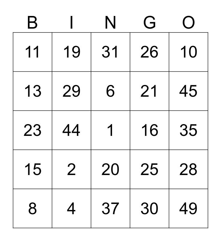 This bingo card has a free space and 24 words: 2, 4, 6, 8, 10, 11, 13, 19, 16, 20, 21, 23, 25, 28, 29, 30, 35, 31, 45, 44, 49, 15, 26 and 37.