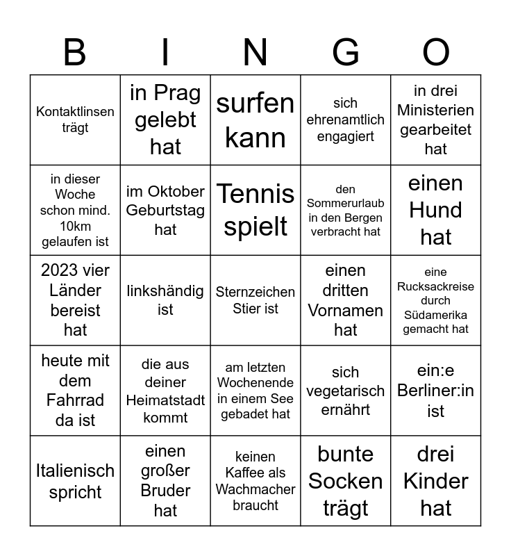 This bingo card has 25 words: die aus deiner Heimatstadt kommt, keinen Kaffee als Wachmacher braucht, Tennis spielt, Italienisch spricht, in drei Ministerien gearbeitet hat, Kontaktlinsen trägt, in dieser Woche schon mind. 10km gelaufen ist, in Prag gelebt hat, einen dritten Vornamen hat, am letzten Wochenende in einem See gebadet hat, den Sommerurlaub in den Bergen verbracht hat, 2023 vier Länder bereist hat, sich vegetarisch ernährt, ein:e Berliner:in ist, im Oktober Geburtstag hat, drei Kinder hat, eine Rucksackreise durch Südamerika gemacht hat, surfen kann, einen Hund hat, linkshändig ist, Sternzeichen Stier ist, einen großer Bruder hat, heute mit dem Fahrrad da ist, sich ehrenamtlich engagiert and bunte Socken trägt.