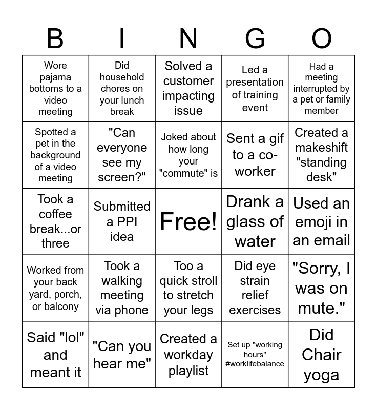 This bingo card has a free space and 24 words: Took a walking meeting via phone, "Can you hear me", Joked about how long your "commute" is, Said "lol" and meant it, Had a meeting interrupted by a pet or family member, Wore pajama bottoms to a video meeting, Spotted a pet in the background of a video meeting, Did household chores on your lunch break, Drank a glass of water, Too a quick stroll to stretch your legs, Sent a gif to a co-worker, Took a coffee break...or three, Did eye strain relief exercises, "Sorry, I was on mute.", "Can everyone see my screen?", Set up "working hours" #worklifebalance, Used an emoji in an email, Solved a customer impacting issue, Created a makeshift "standing desk", Submitted a PPI idea, Did Chair yoga, Worked from your back yard, porch, or balcony, Led a presentation of training event and Created a workday playlist.